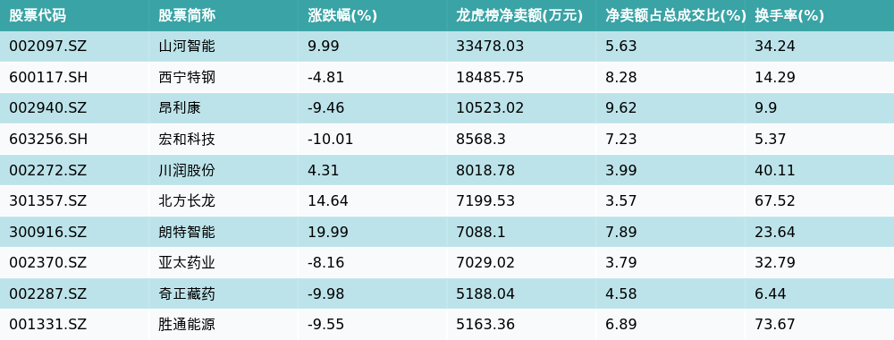 南财智讯8月5日电,南财金融终端数据显示,因当日异动登上龙虎榜的个股中天宇优配 ,龙虎榜中资金净流出最多的前三位分别是山河智能(002097.SZ)、西宁特钢(600117.SH)与昂利康(002940.SZ)。其中排名第一的山河智能被净卖出3.35亿元,占总成交金额的5.63%。山河智能收盘上涨9.99%,换手率为34.24%。净卖出额前10个股详情见下图: