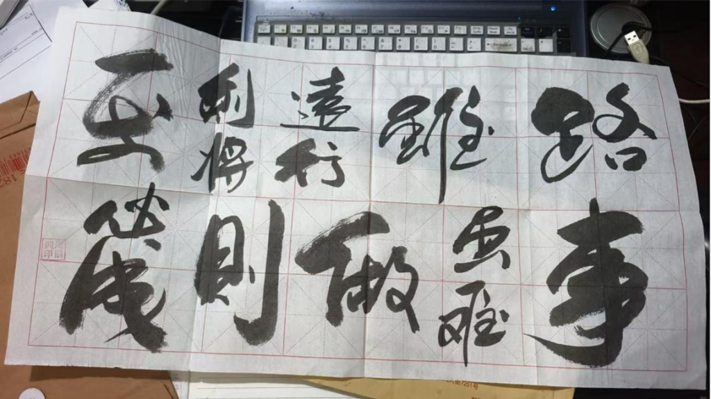 王佳将周昆训生前写的一幅书法作品送给张培。受访者供图